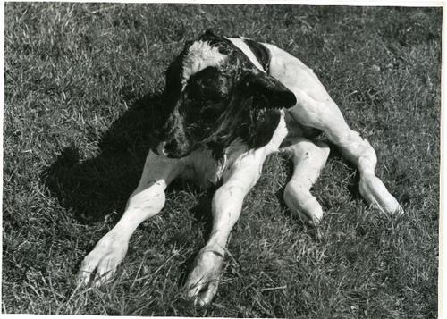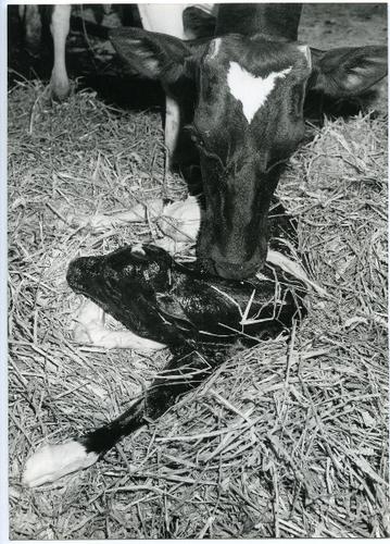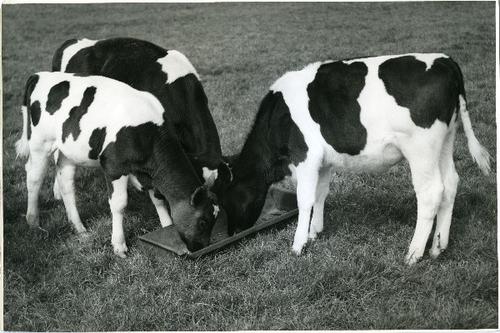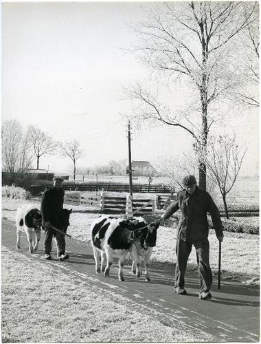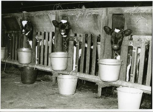 Foto in zwart-wit van kalveren op stal door J.D. de ...