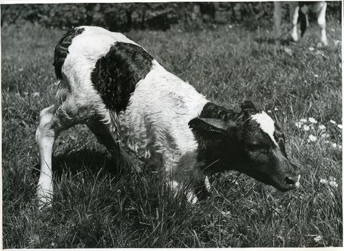 Foto in zwart-wit van een pas geboren kalf in de wei...