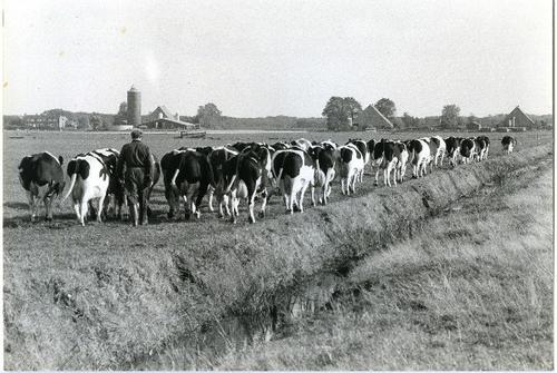 Foto in zwart-wit van het verweiden van koeien door ...