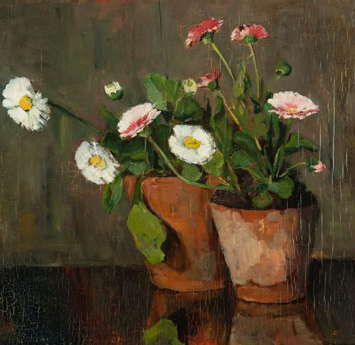Twee bloempotten met primula's