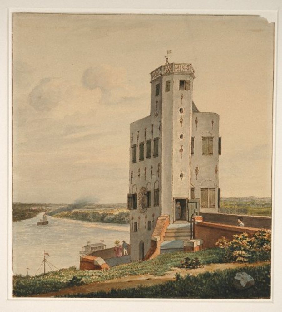 Gezicht vanaf de wal op de Belvedere en de Waal