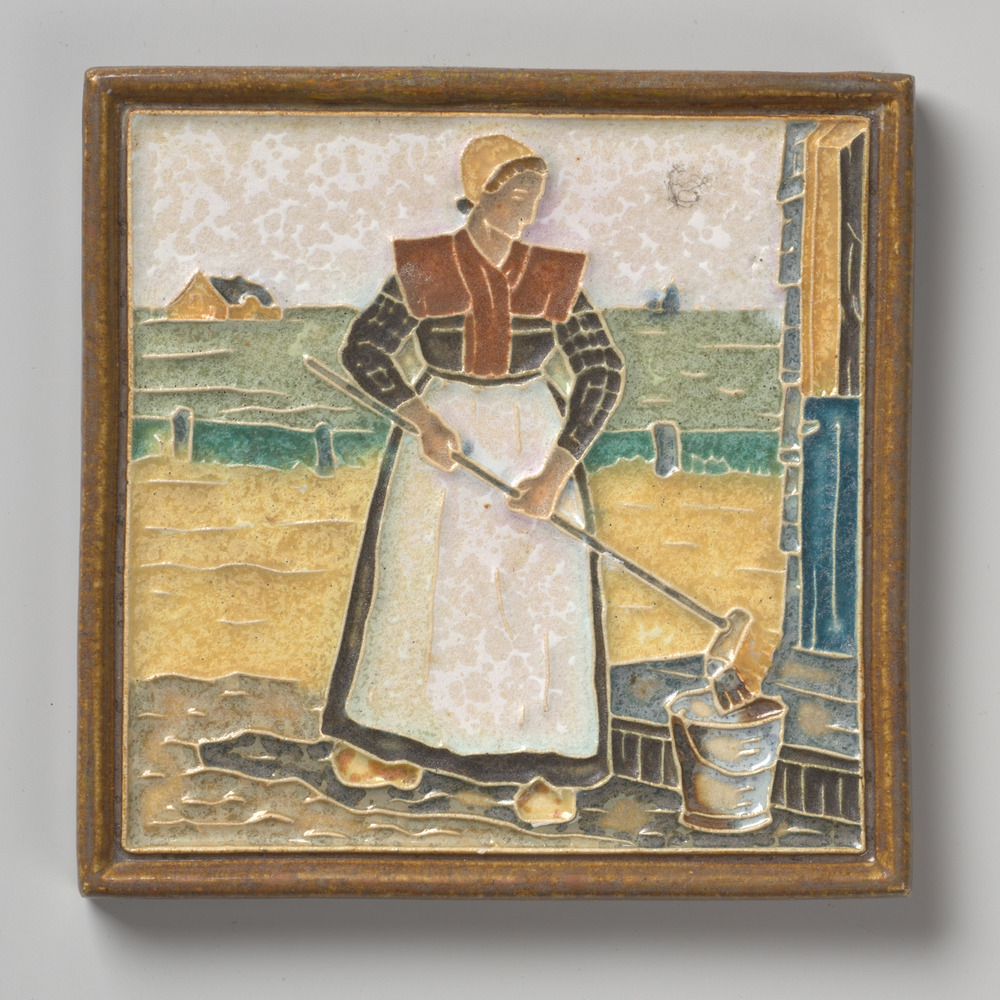 Tegel van keramiek met tinglazuur, voorstellende: vr...