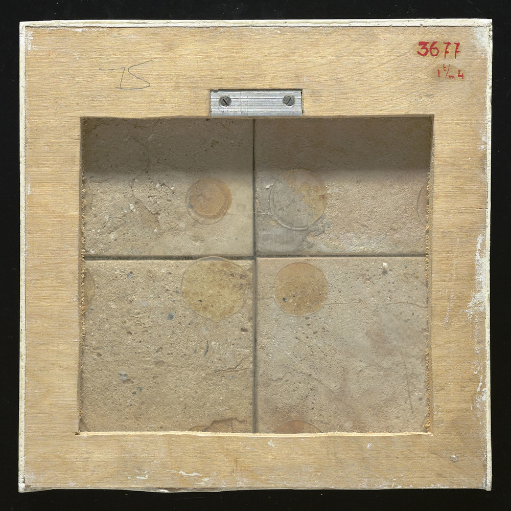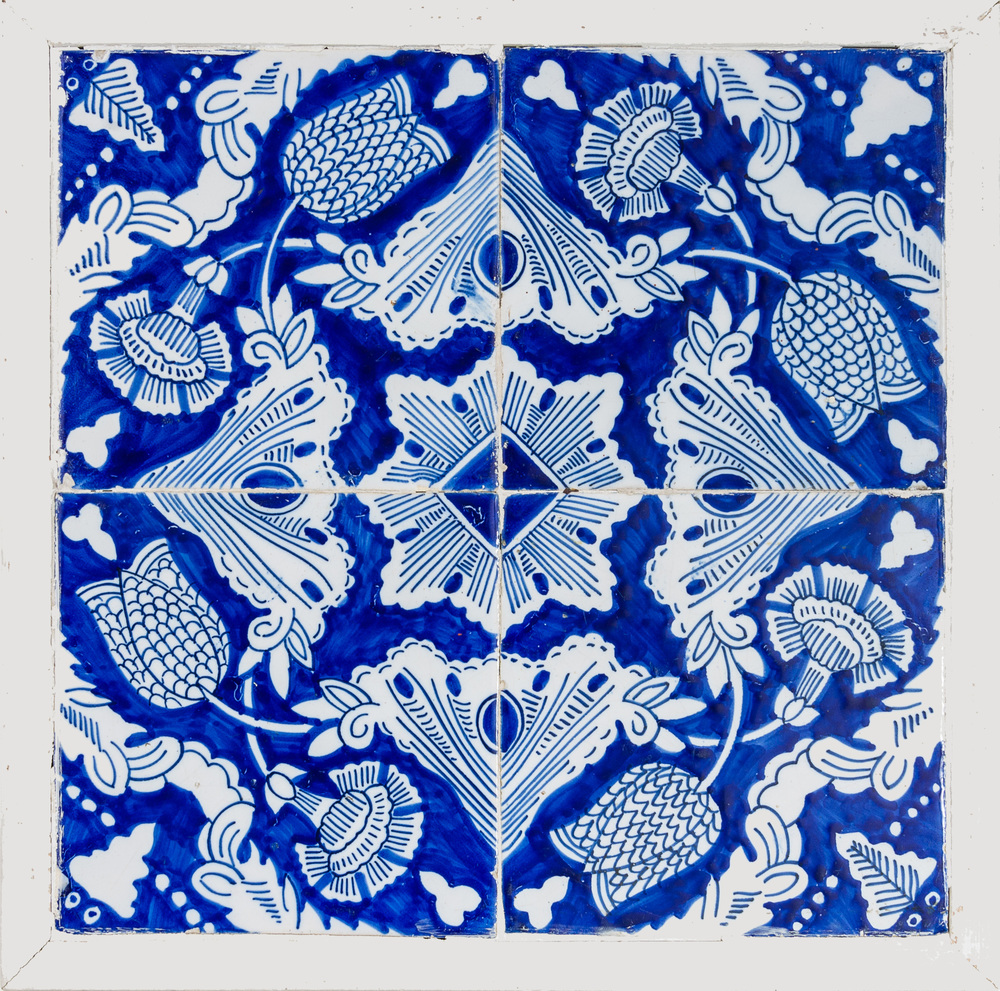 Tegelveld van 4 blauwe tegels van aardewerk met ting...