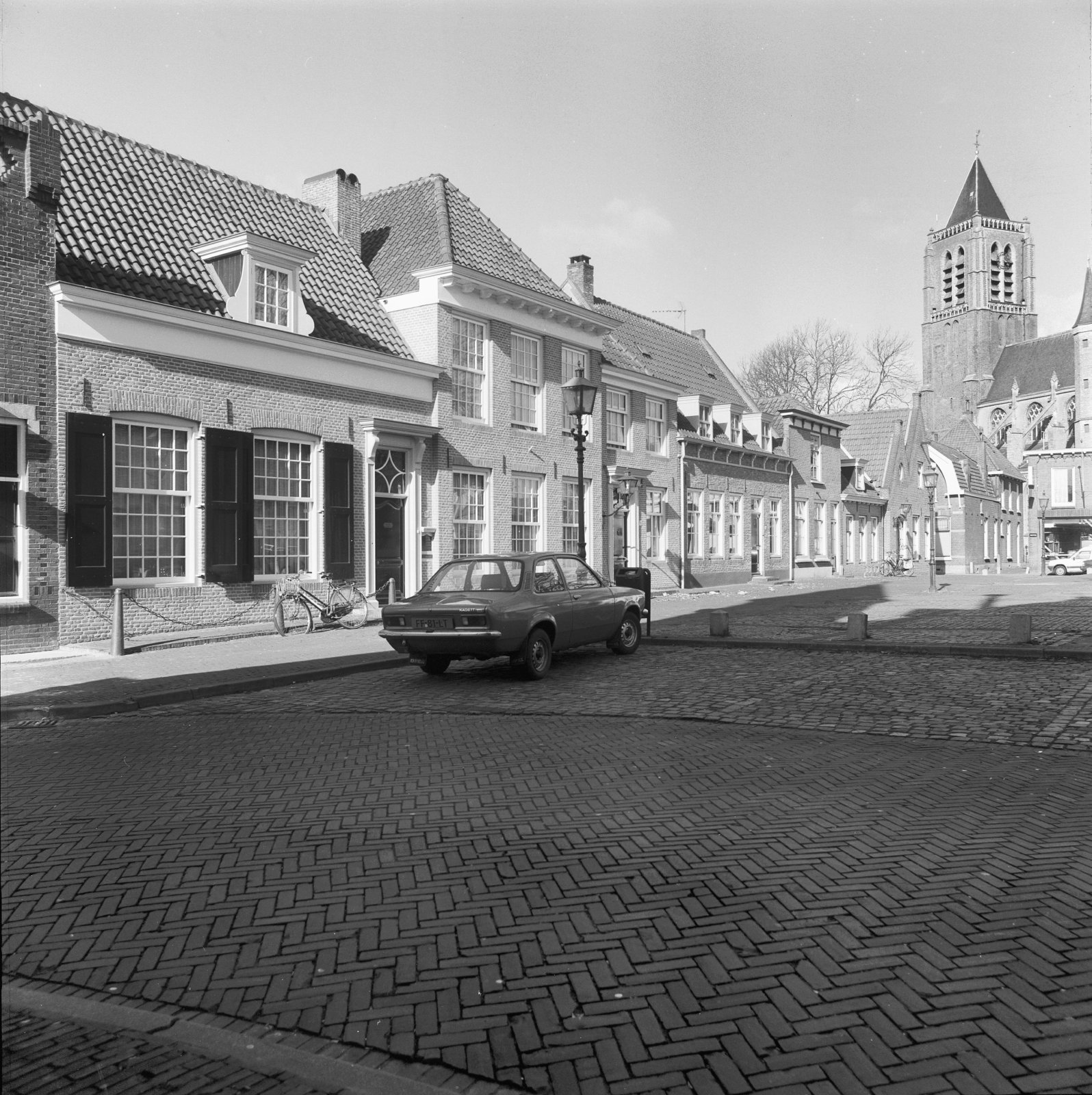 Voorgevels en straat, met op de achtergrond de kerk