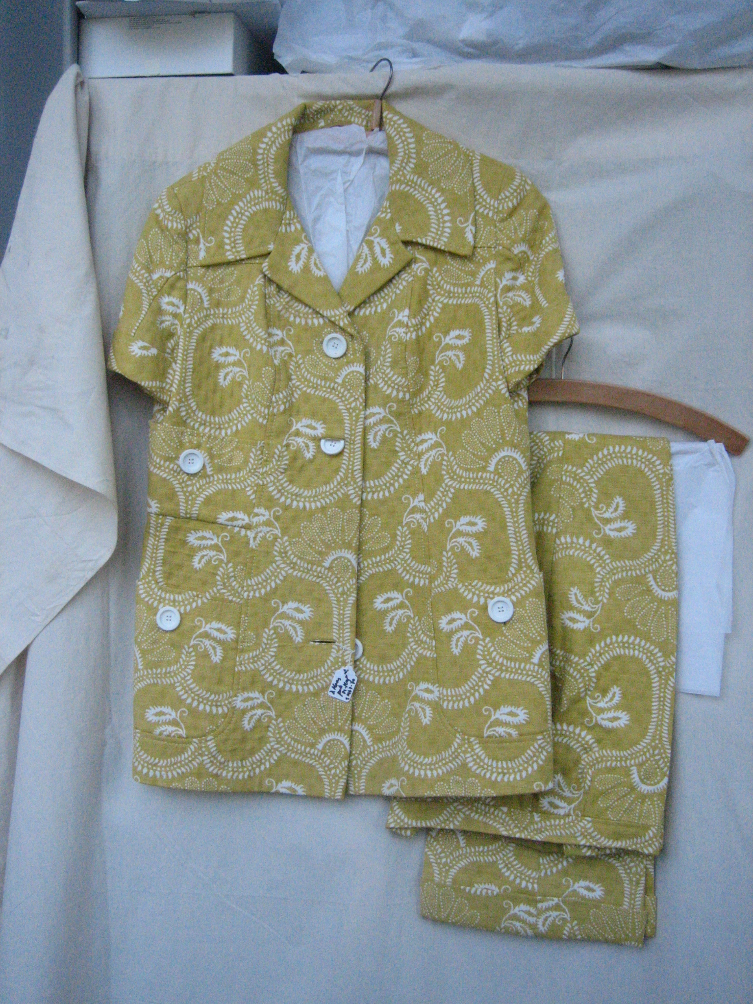 Broekpak bestaande uit jasje en broek van geel katoe...