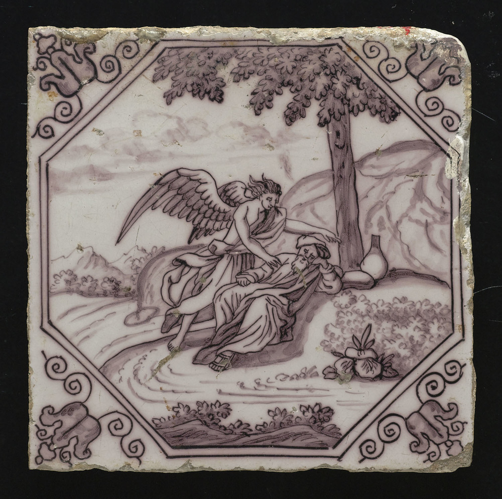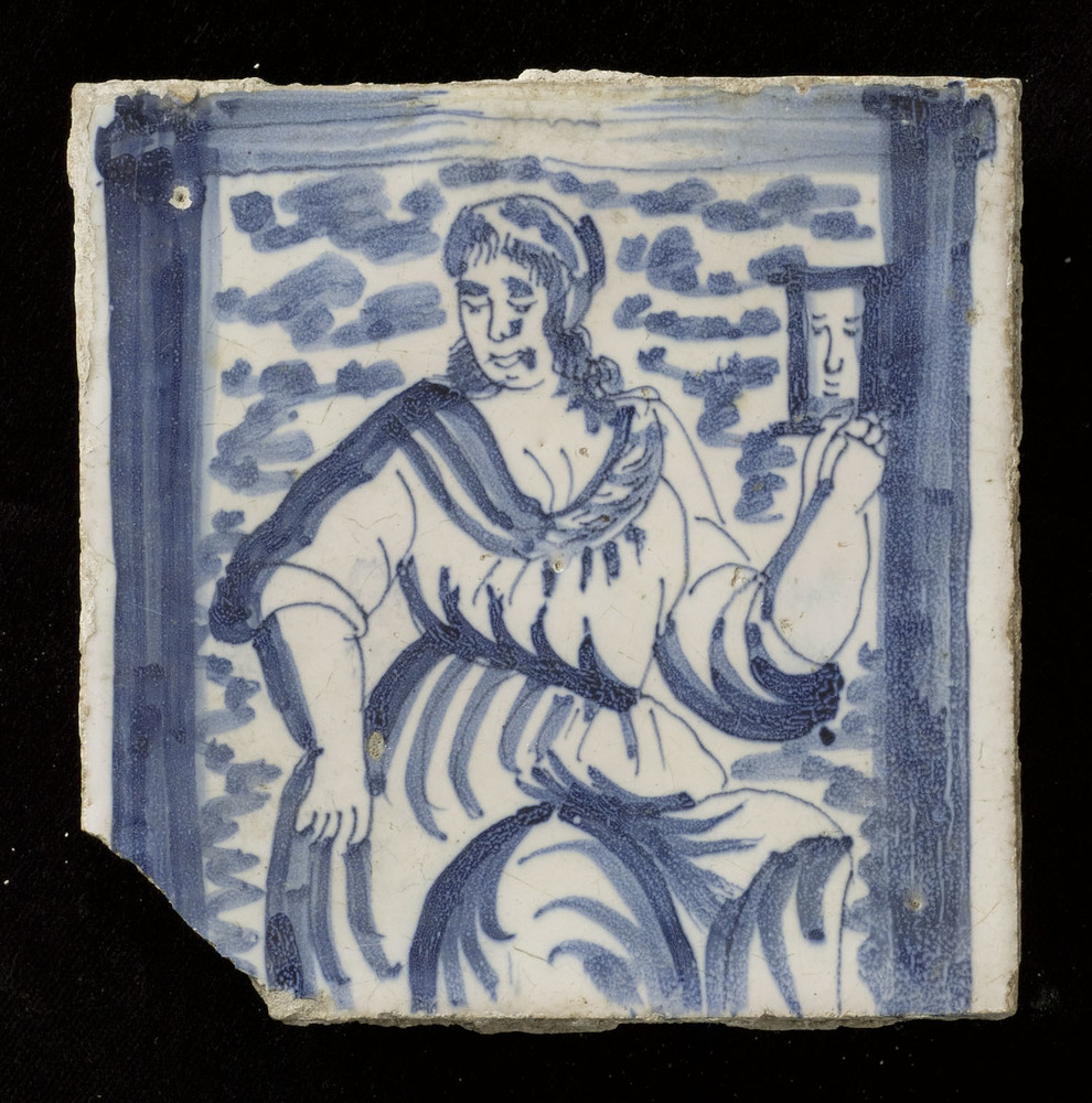 Tegel van keramiek met tinglazuur, voorstellende: De...
