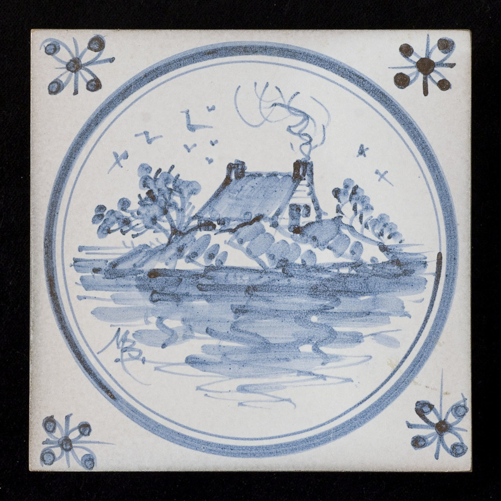 Tegel, geschilderd, met voorstelling: Huisje op gron...