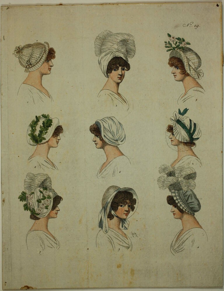 Portret van negen dames met diverse hoofddeksels
