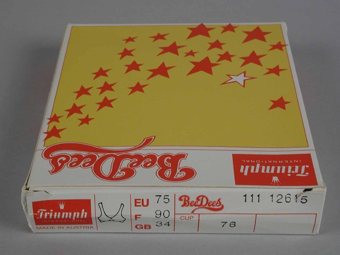 Kartonnen doos van bustehouder, rode sterren op geel...