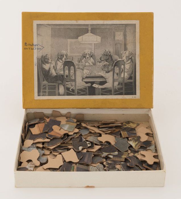 Legpuzzle in doos: zeven kaartende honden rond tafel