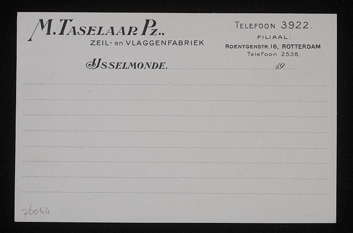 Briefkaart van M. Taselaar Pz., zeil- en vlaggenfabriek