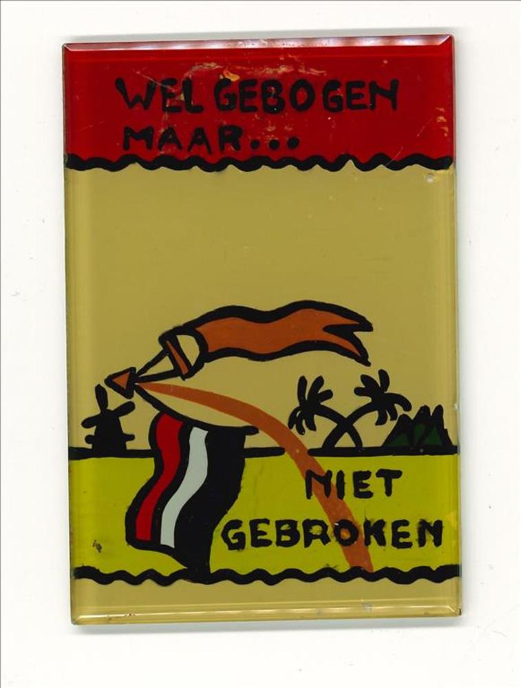 Tegeltje met daarop de tekst Wel gebogen maar .........