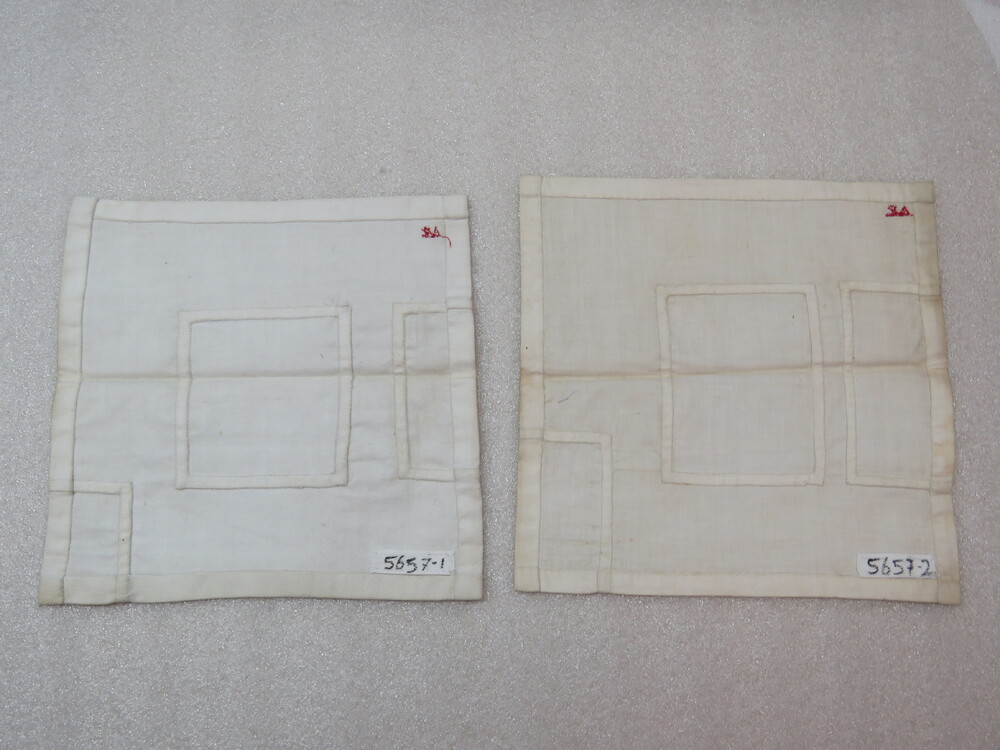 proeflap van witte katoen met monogram A E, circa 1900