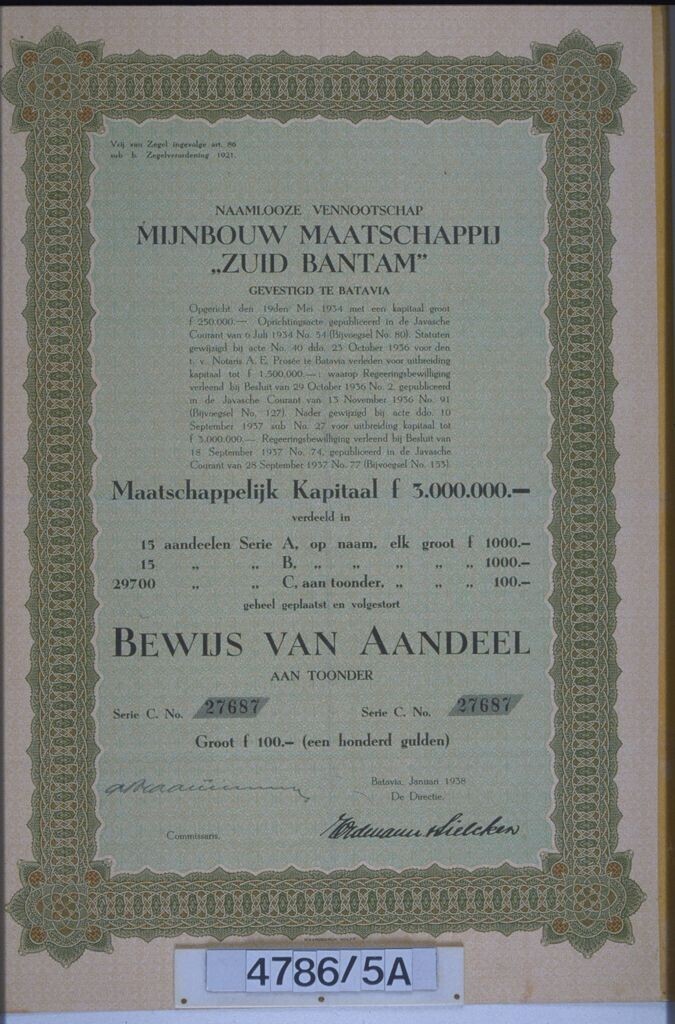 Bewijs van aandeel N.V. Mijnbouw Maatschappij 'Zuid ...