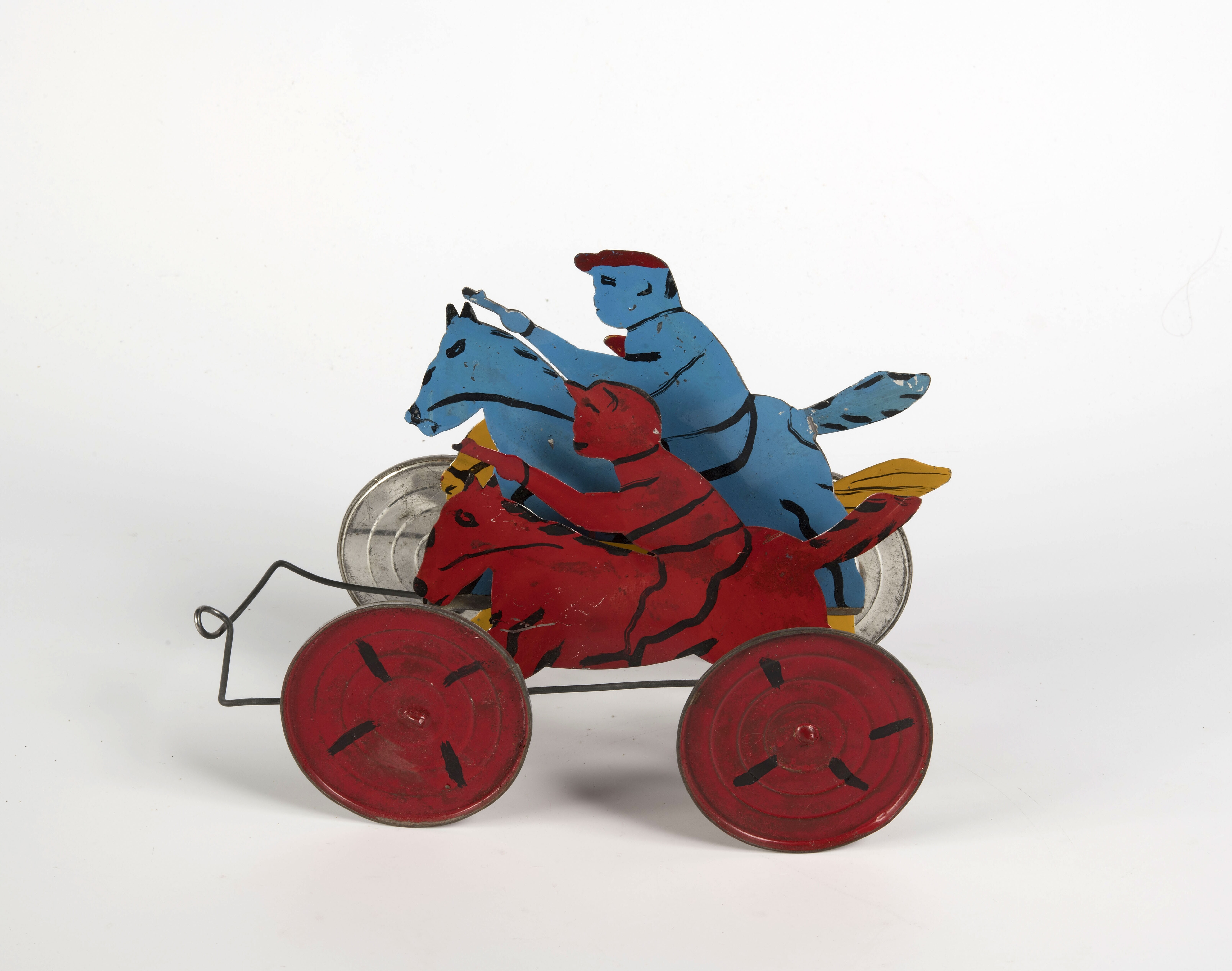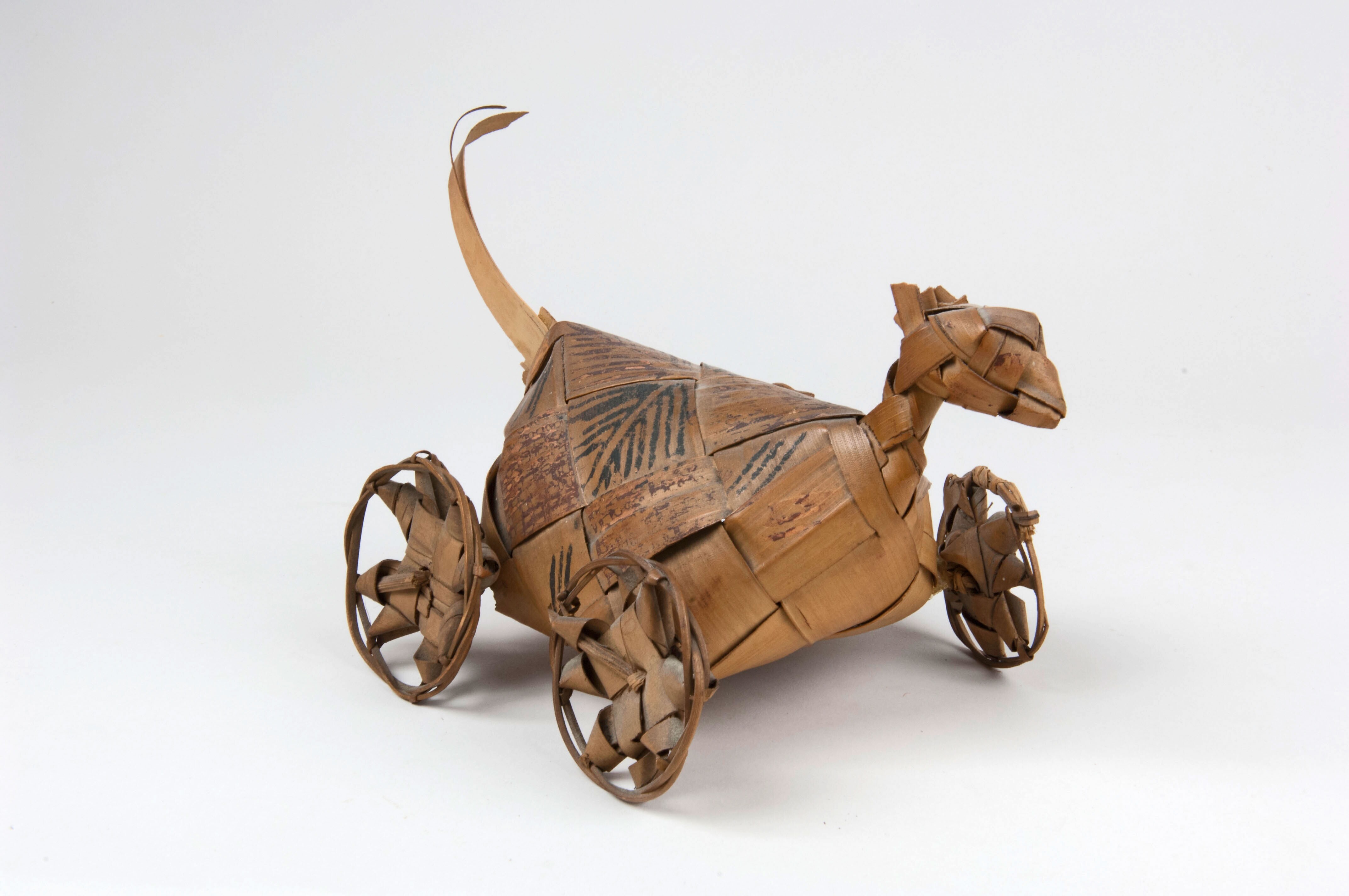 Een speelgoeddier op vier wielen vervaardigd uit rep...