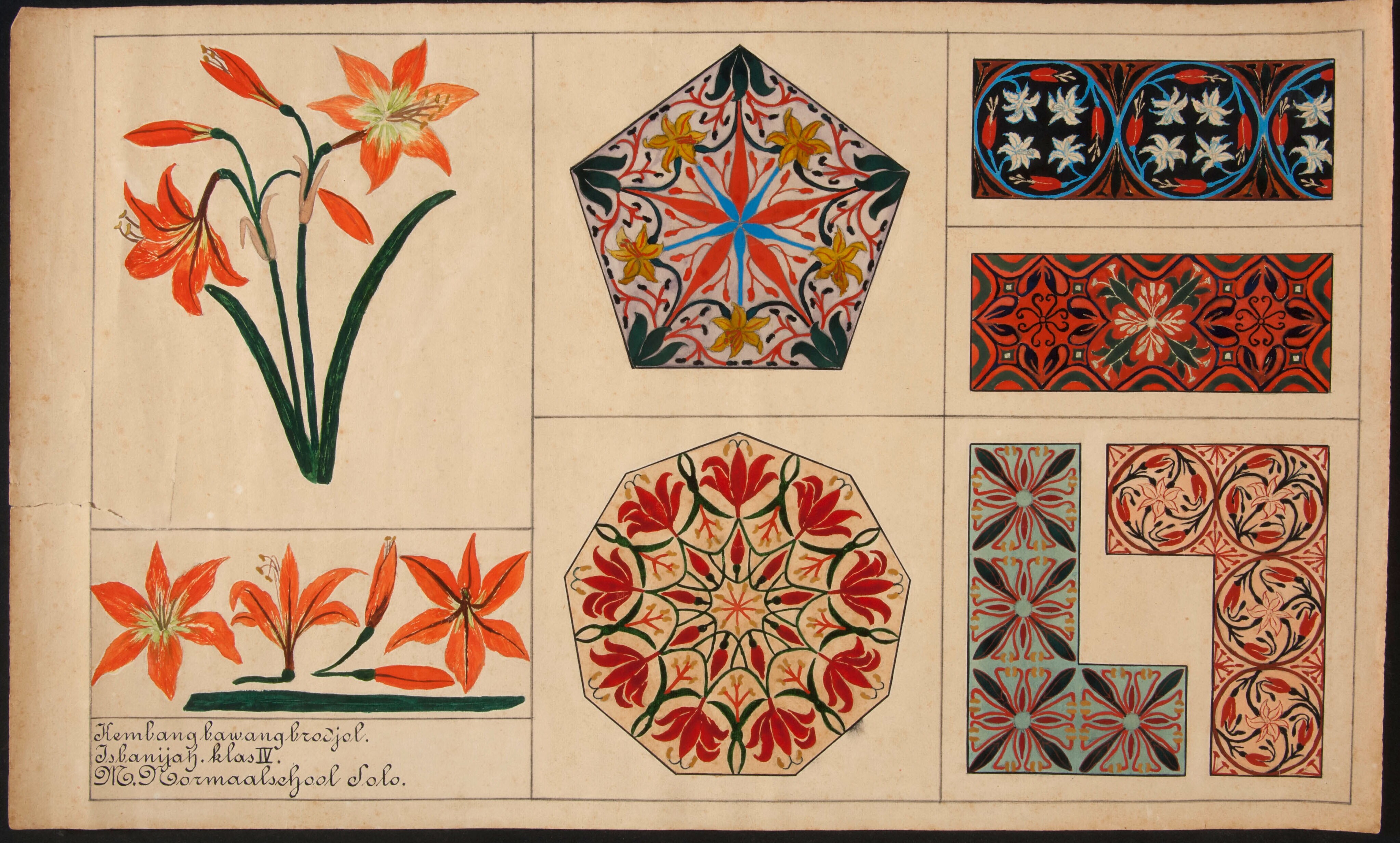 Gekleurde bloemmotieven uit het tekenonderwijs in Solo