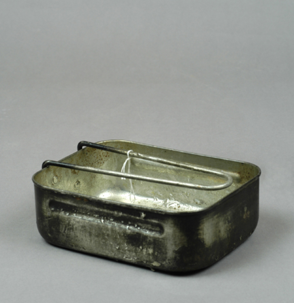 2 ijzeren messtins met scharnierende handgreep, 1940...