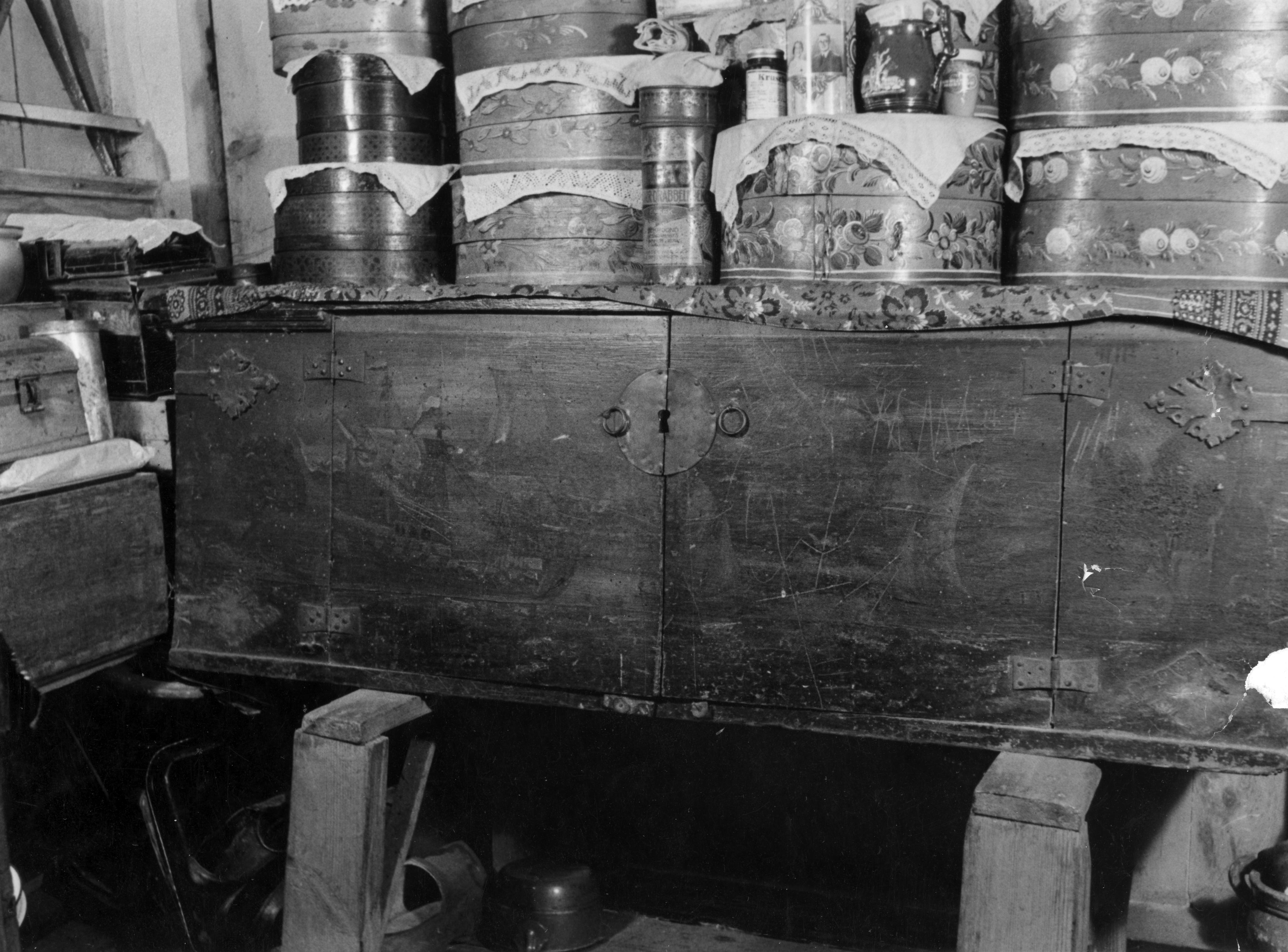 Beschilderde houten kist, Marken, 1943 (zwart-wit foto)
