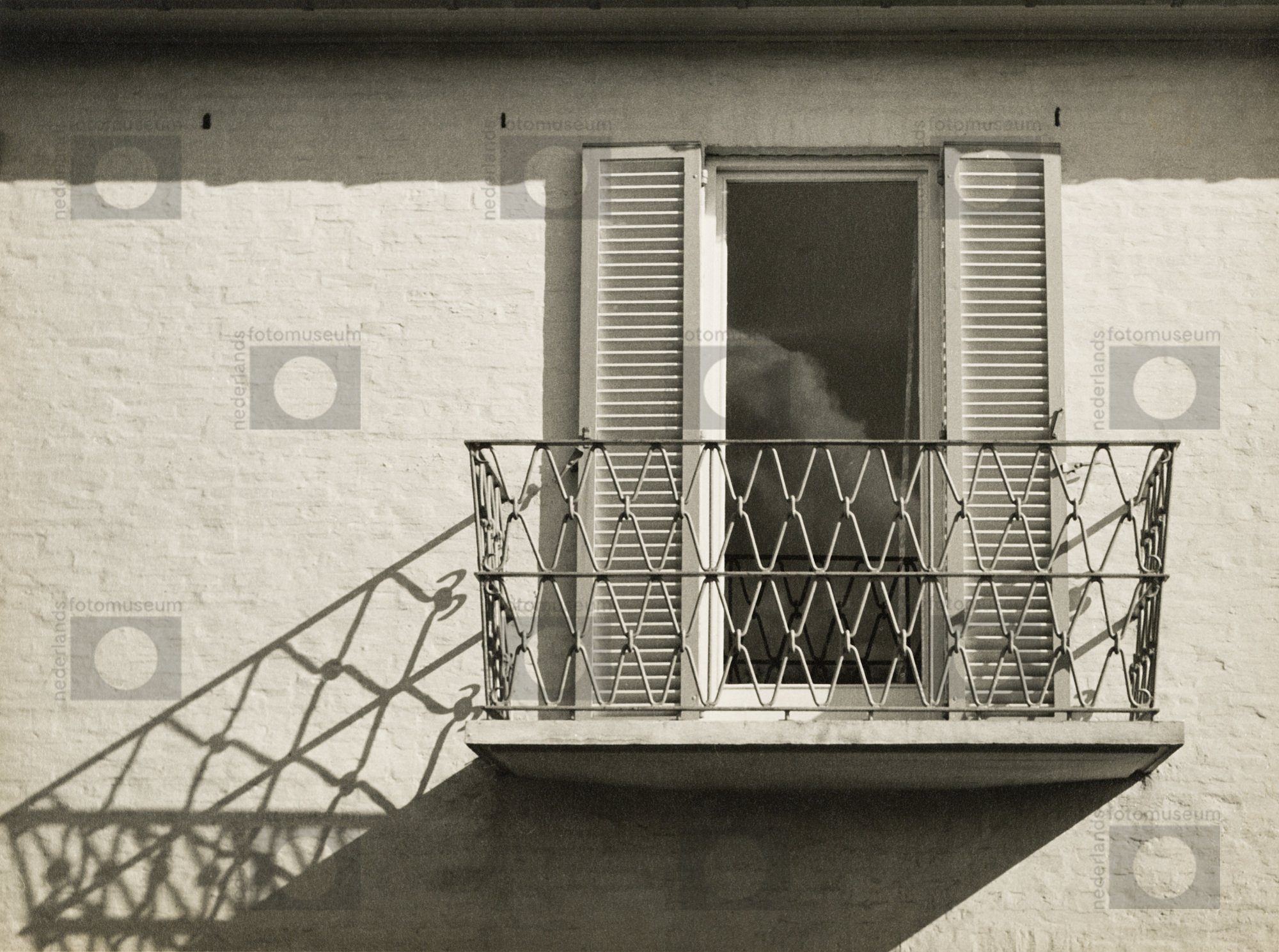 balkon met hekwerk met luiken tegen wit woonhuis