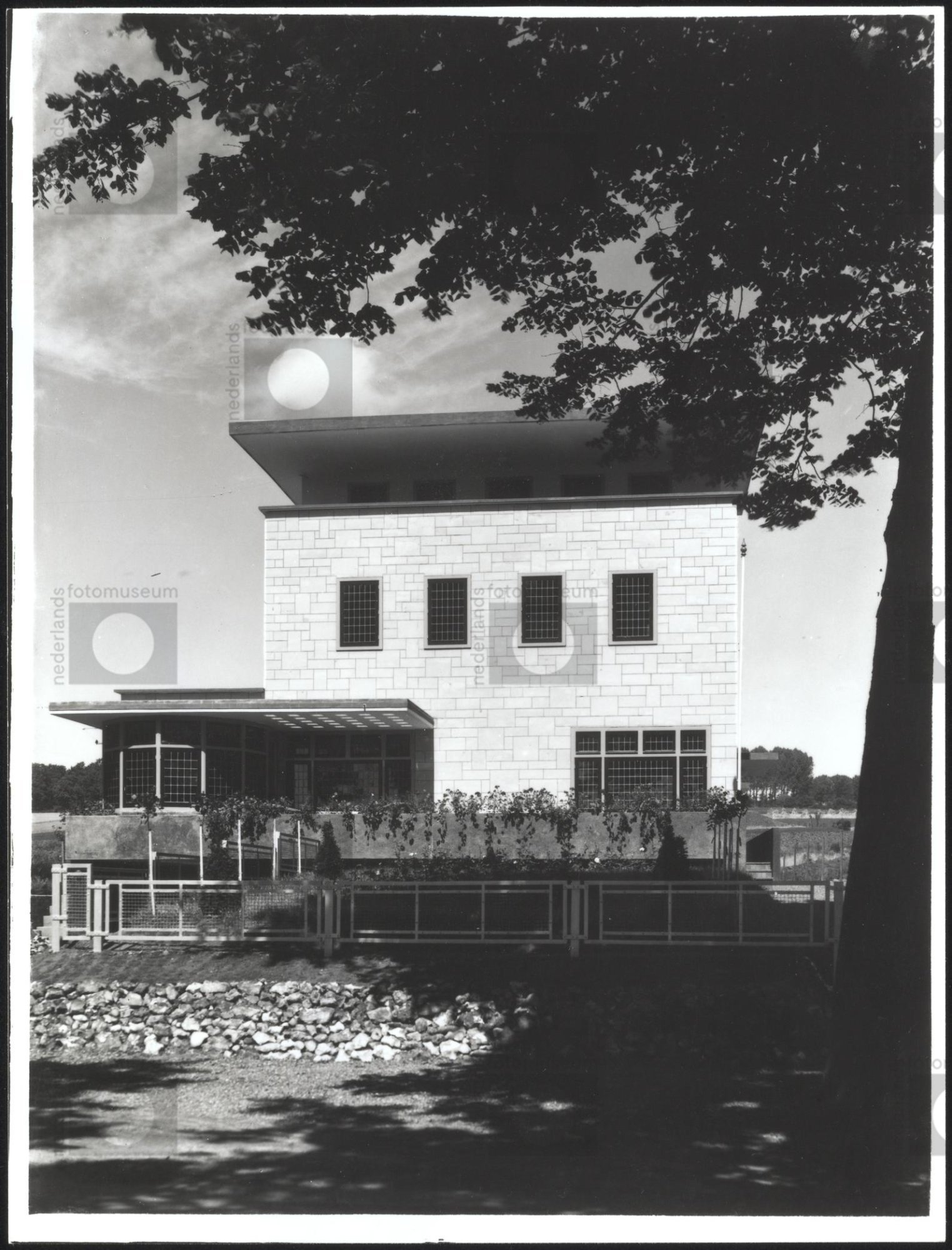 moderne villa met boom voor in beeld