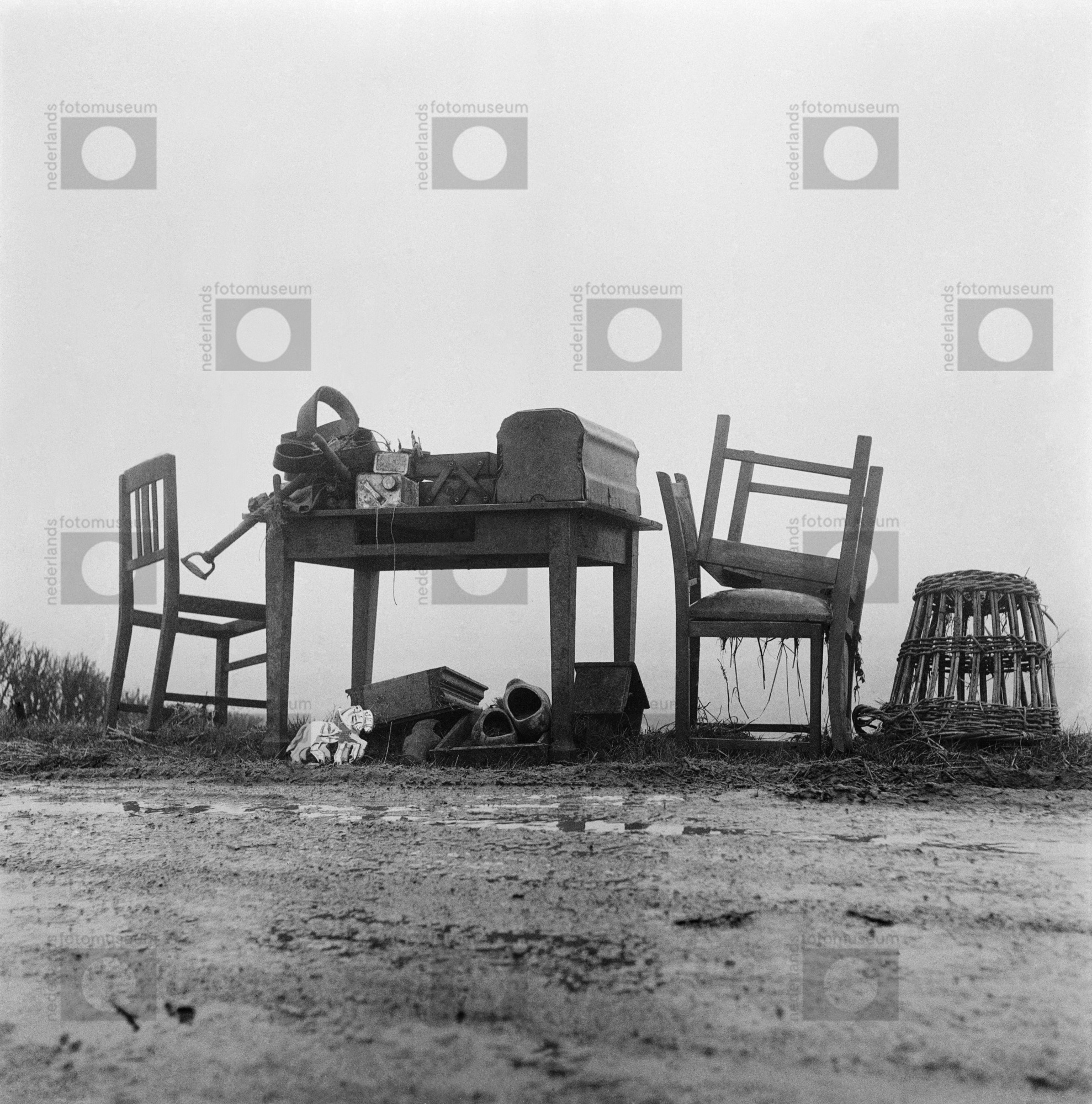Opgestapelde huisraad, Watersnoodramp, Heijningen, N...