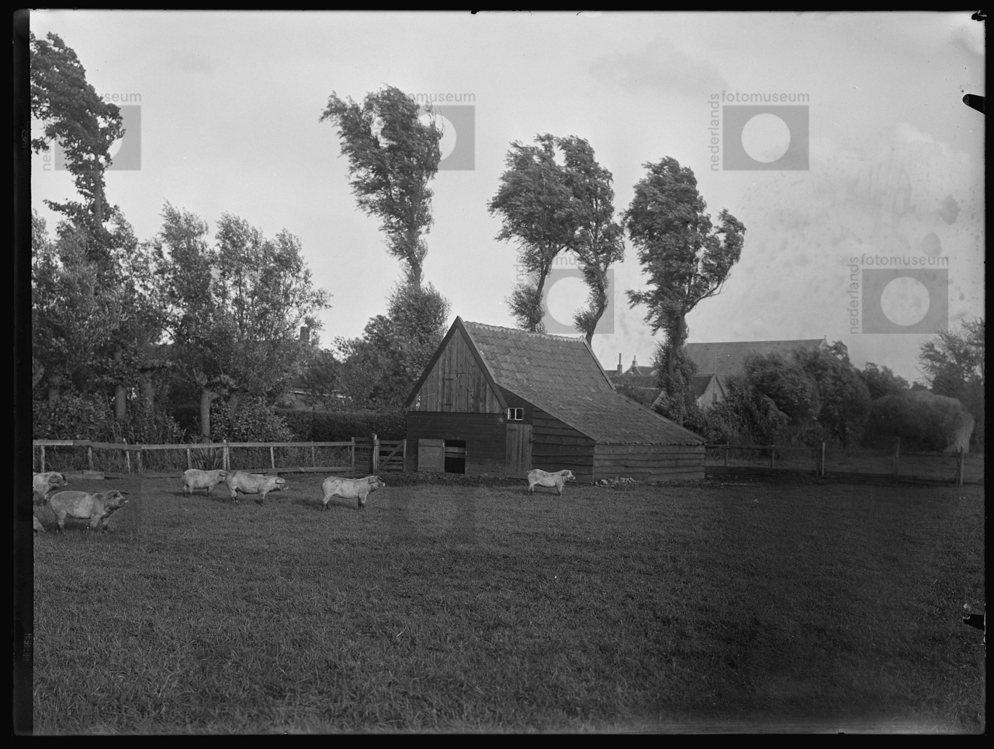 Weiland met varkens en varkenshok langs het fietspad...