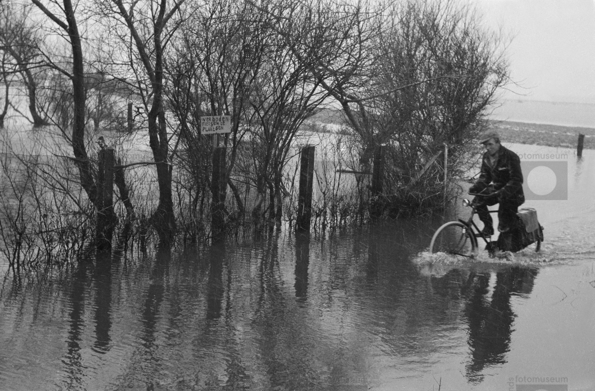 Overstroomd landschap met fietser na de Watersnoodra...