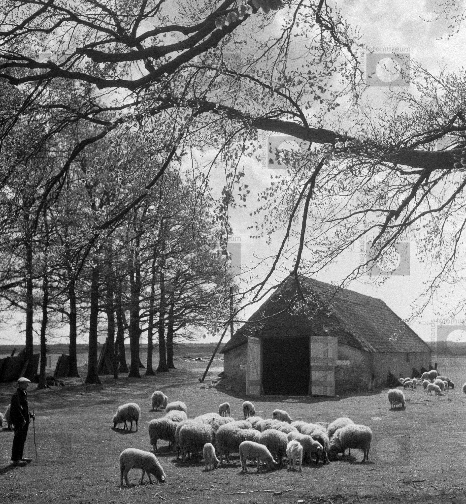 Herder met kudde schapen bij schaapskooi De Ginkel b...
