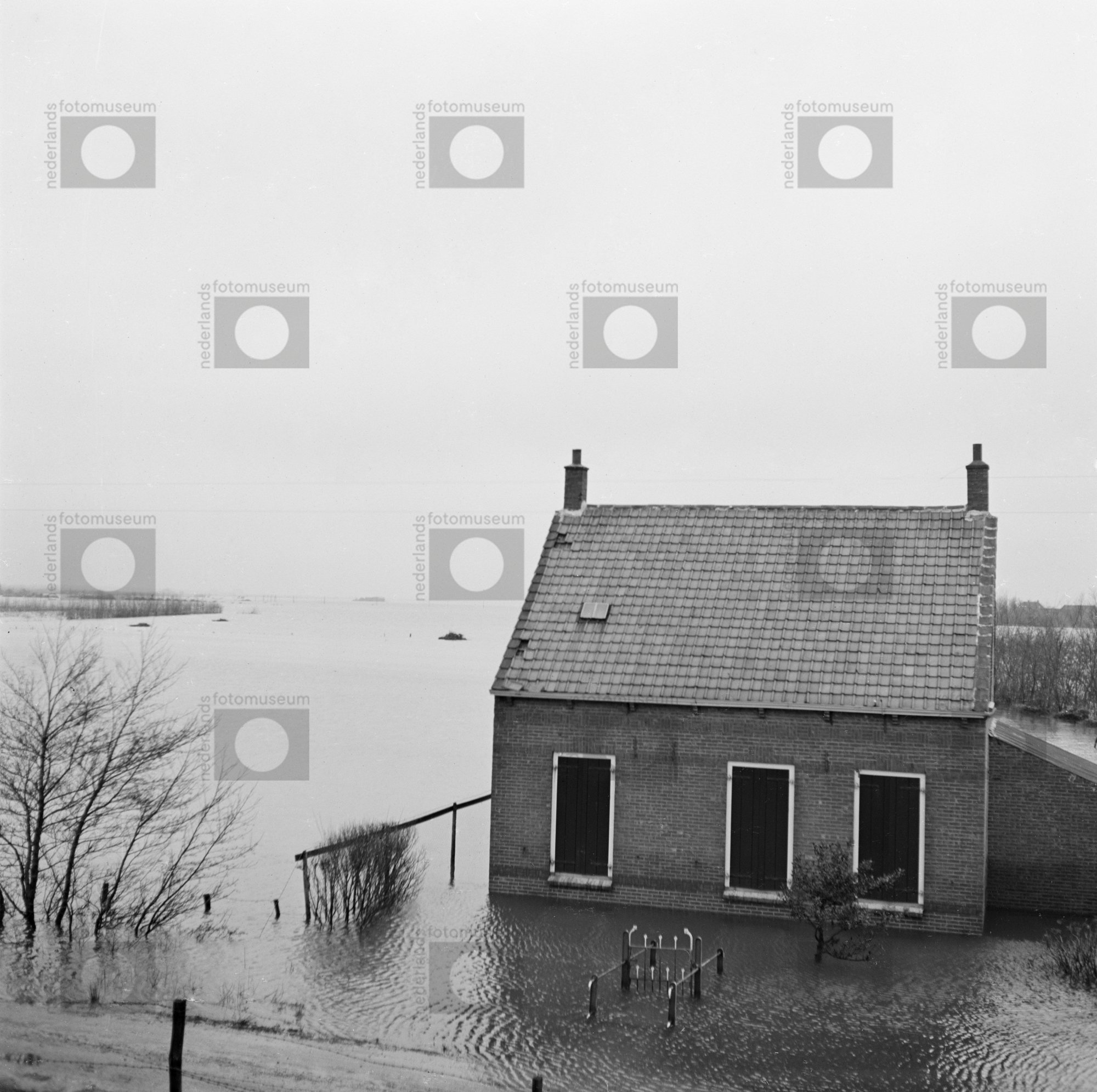 Boerderij in ondergelopen landschap na de Watersnood...