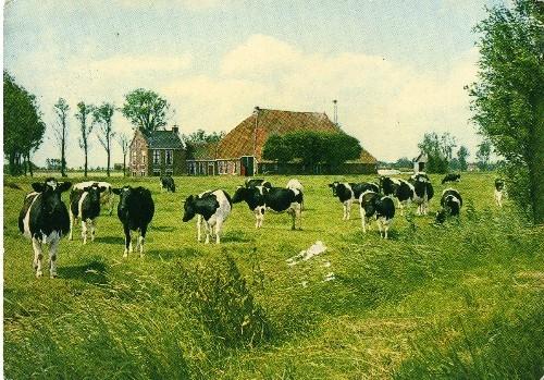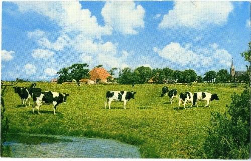 prentbriefkaart in kleur van een landschap met koeie...