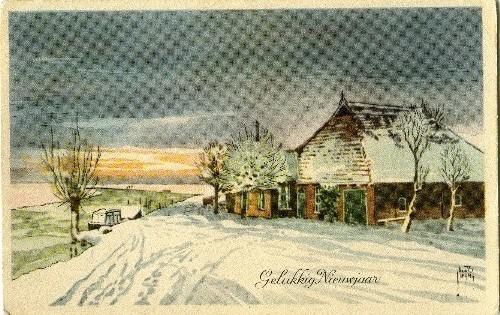 prentbriefkaart in kleur van een boerderij in winter...