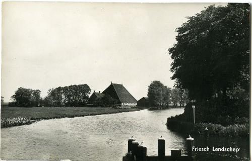 Prentbriefkaart in zwart-wit van een boerderij met f...