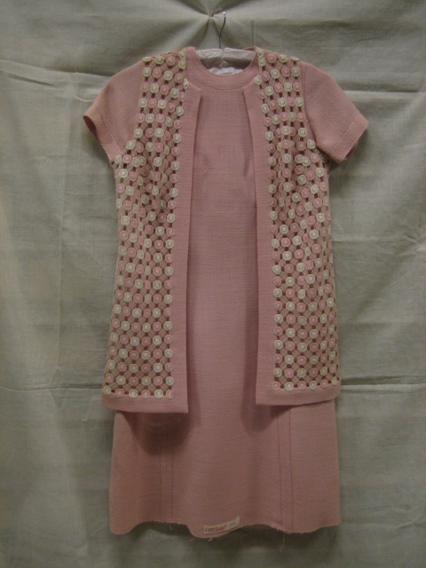 Ensemble bestaande uit jurk van roze wol in linnen b...