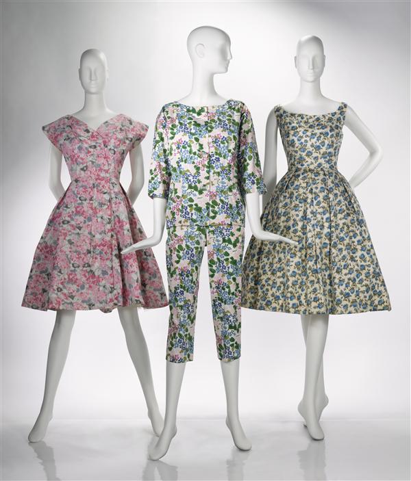 Ensemble, van witte zijde bedrukt met patroon van bl...
