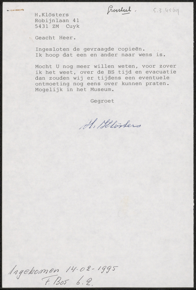 Brief H. Klösters over vlag in Groesbeek, + adressen...