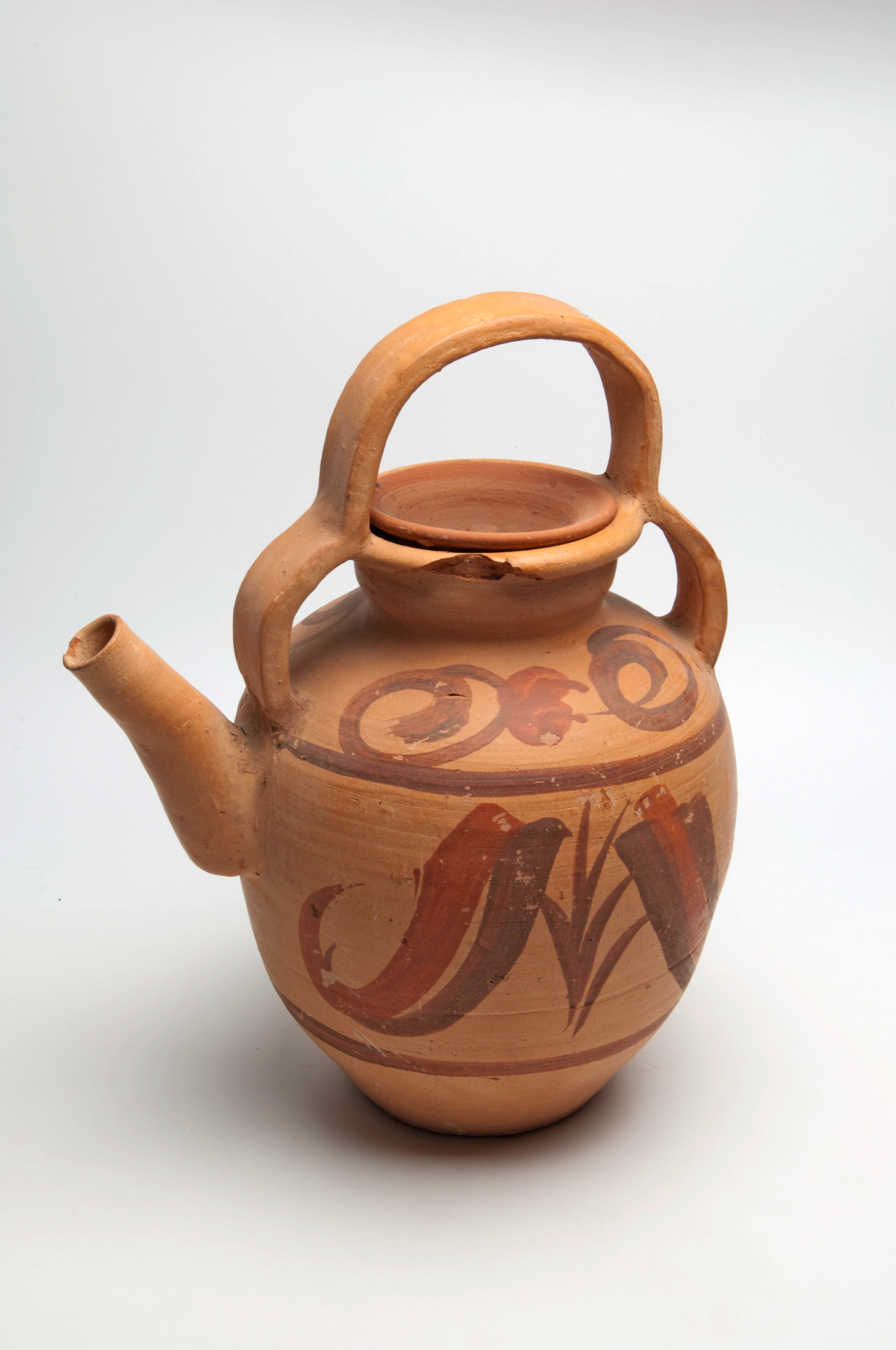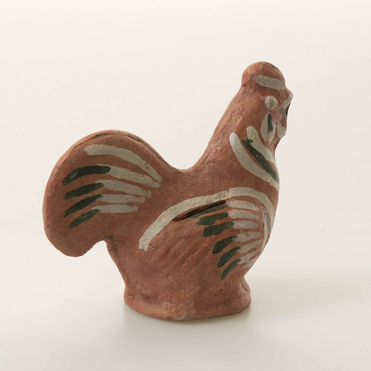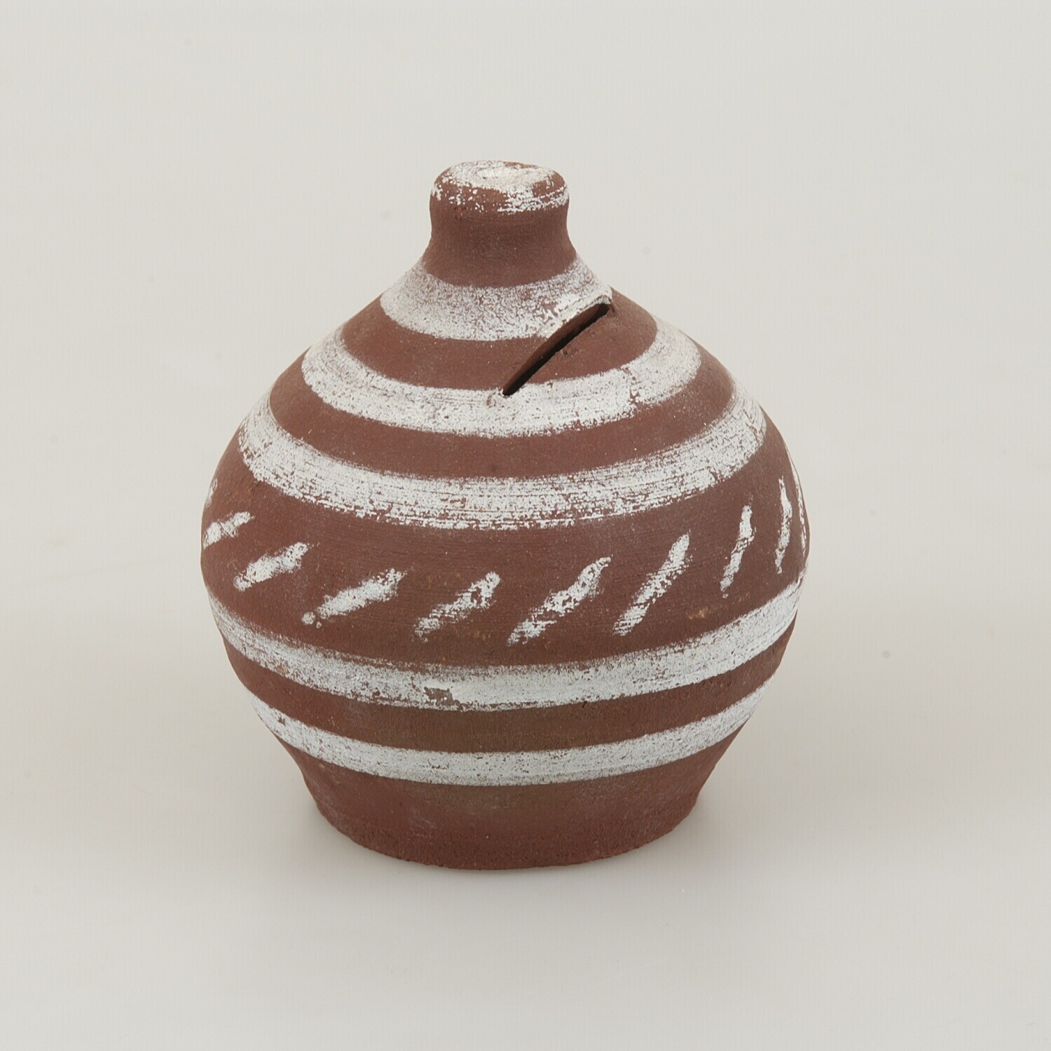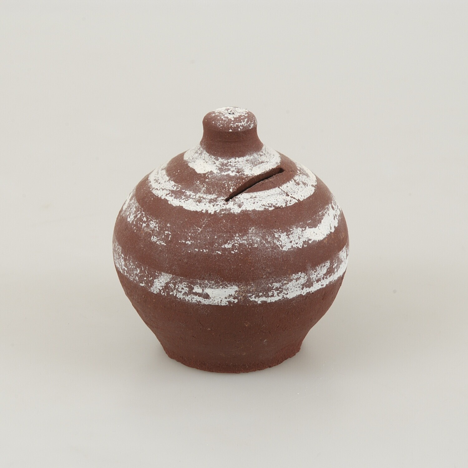 Beschilderde spaarpot van aardewerk in de vorm van e...