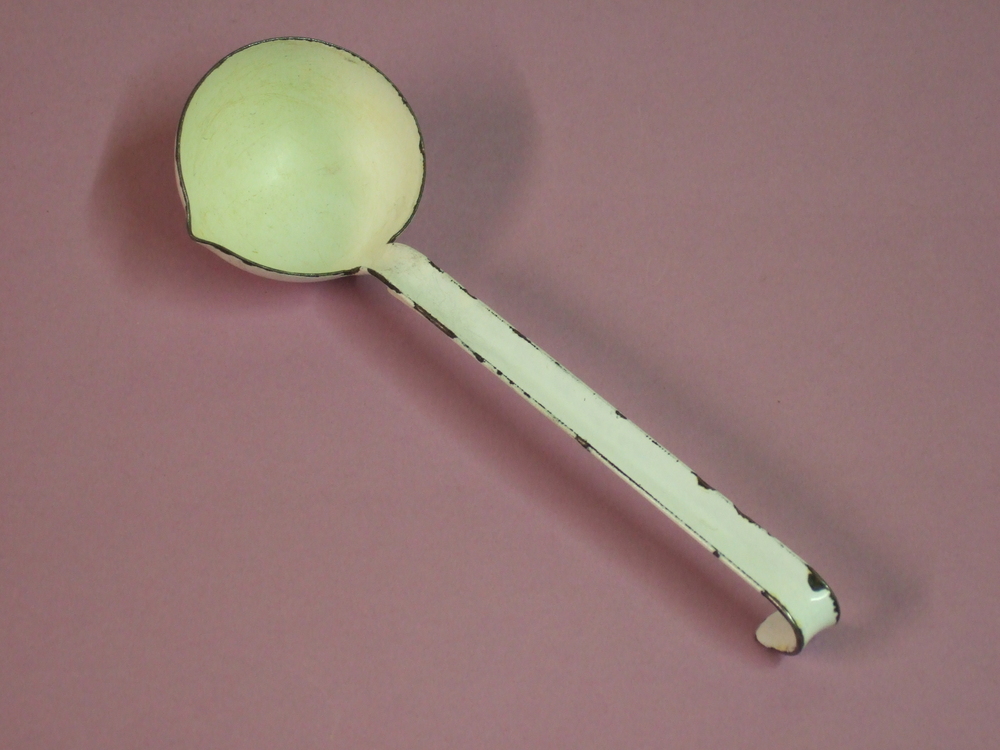 Juslepel van ijzer met witte emaille.