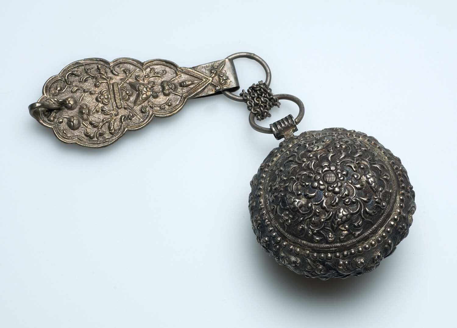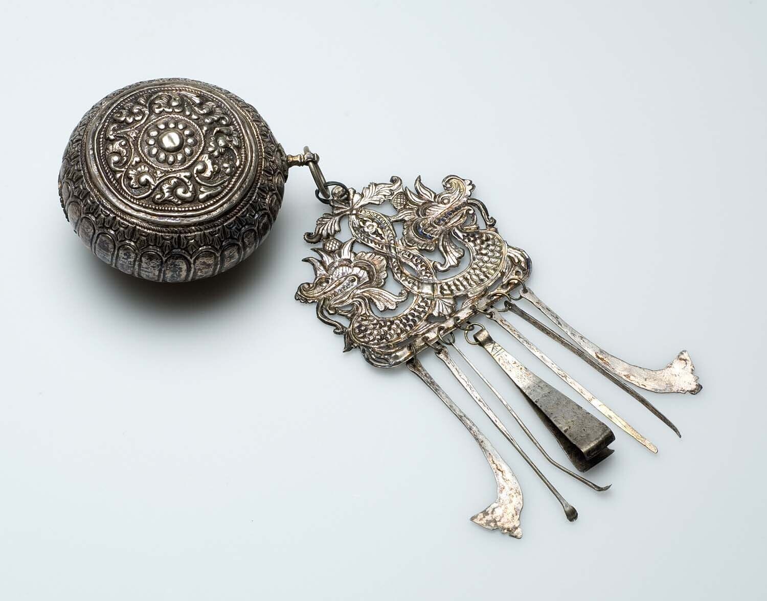 Zilveren sirihdoos met toiletgerei met slangenversie...
