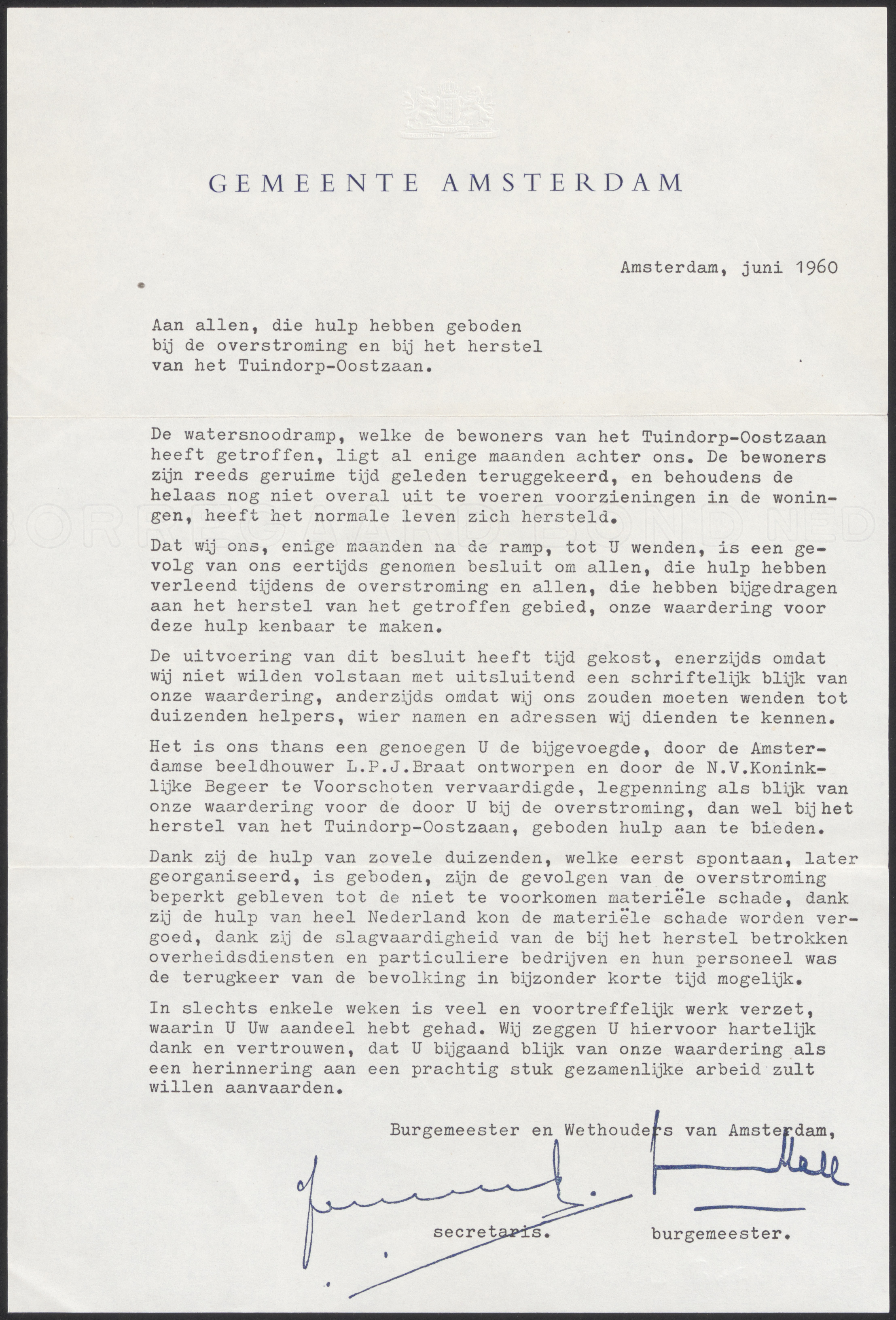 Brief van gemeente Amsterdam van juni 1960