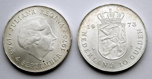 Zilveren Nederlandse betaalmunt, 10 Gulden, 1973