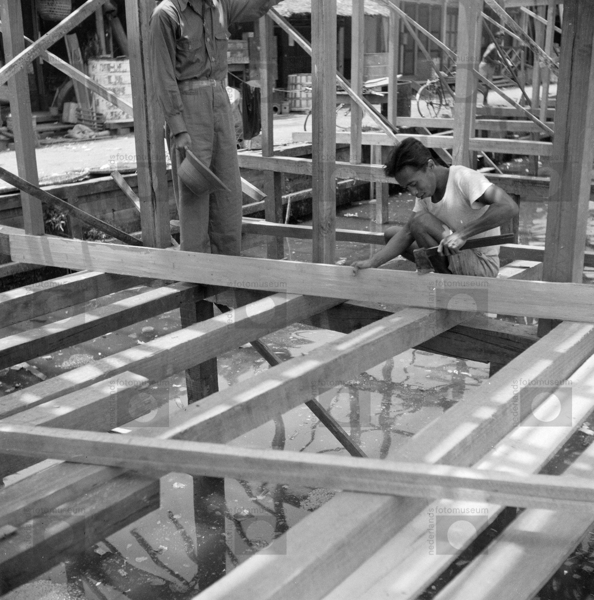Bouw van een paalwoning in Pontianak op Borneo, Indo...