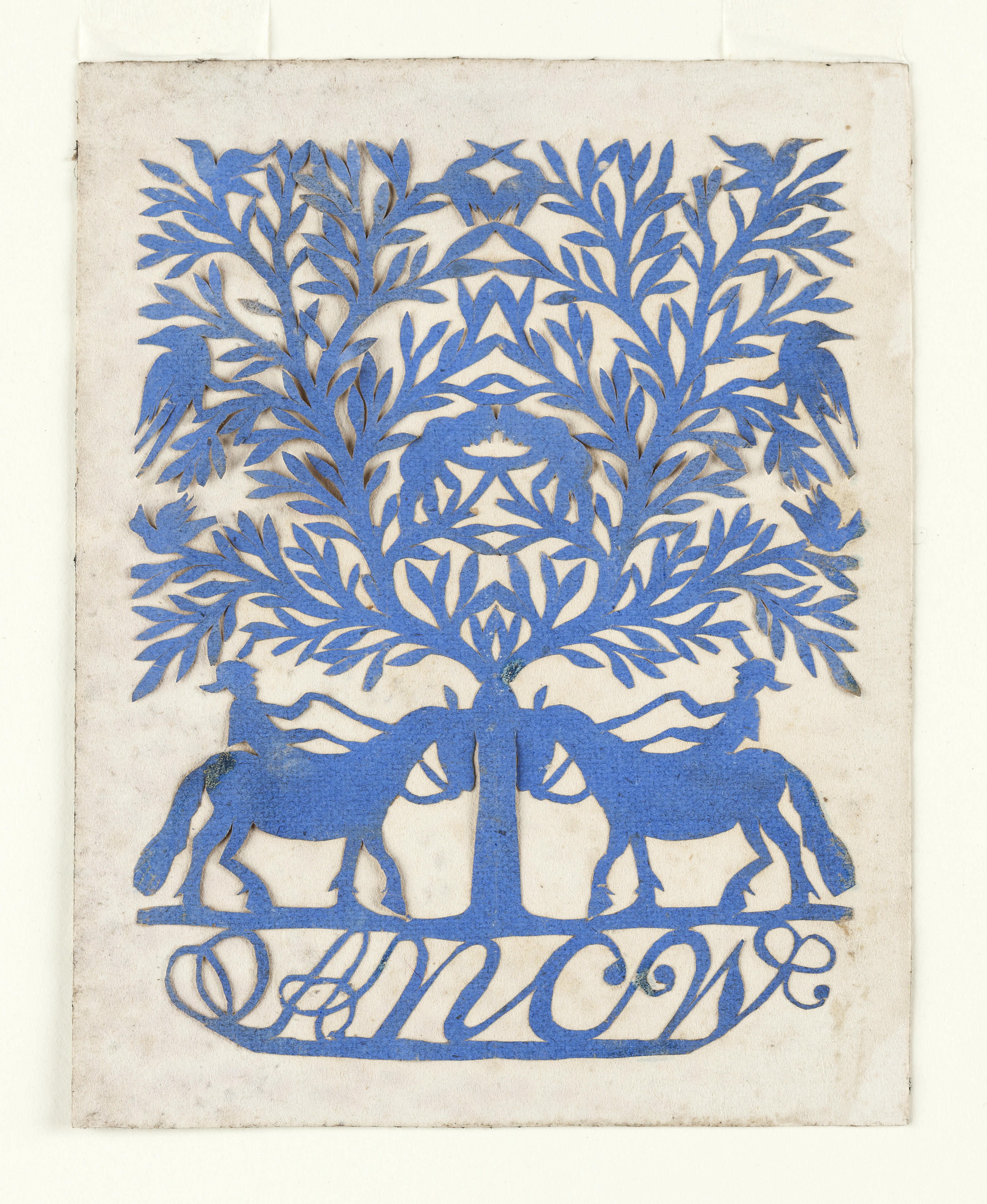 Symmetrisch knipsel van een boom met ruiters, 1890–1900