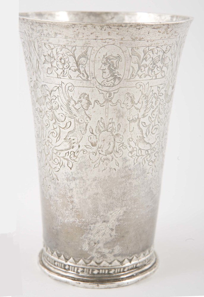 Gildebeker van zilver, op ronde voet, met rijke grav...