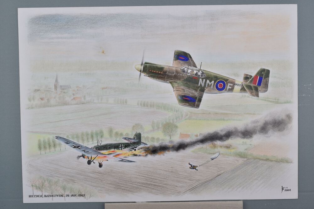 Pasteltekening van Mustang 'NM-F' die een Ju-52 neer...