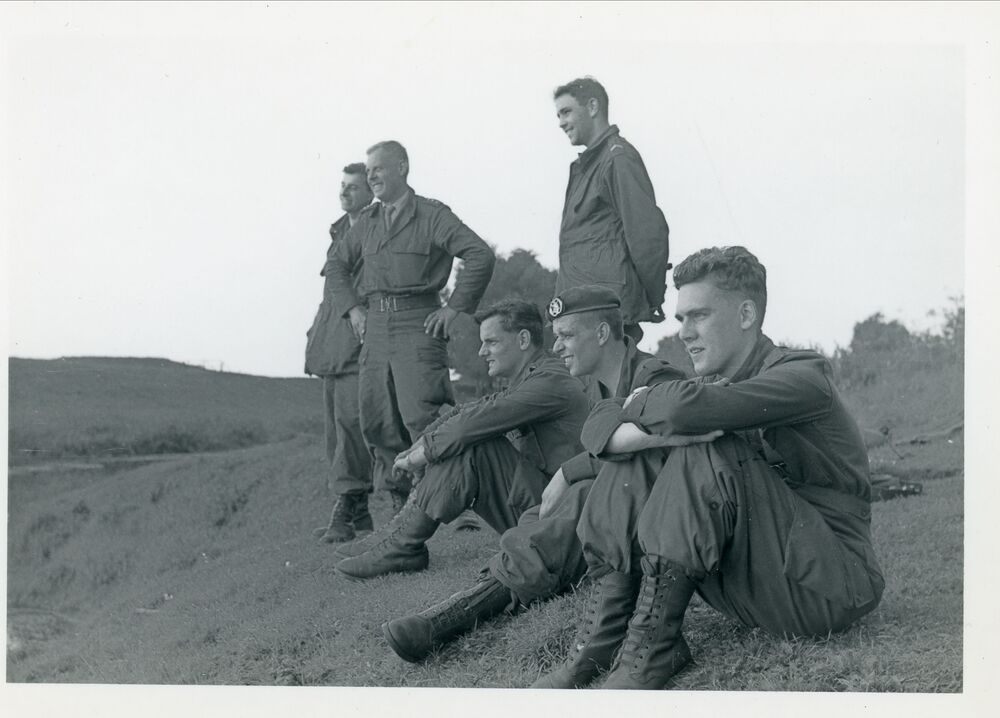 Een aantal soldaten zitten en staan op de hei en kij...