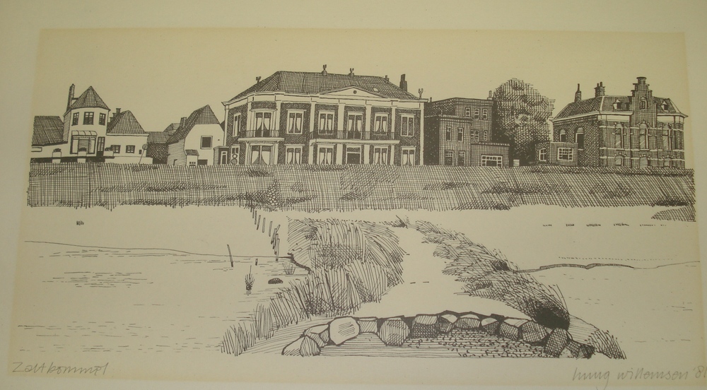 gravure op papier, Waalkade bij Zaltbommel 1981