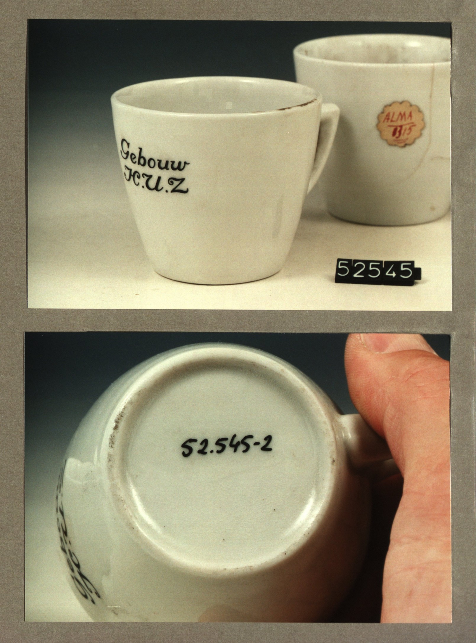 Kop met opschrift, model P met decor Gebouw H.U.Z.