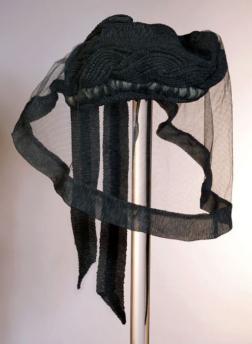 Zwarte V-vormige dameshoed, geplooide stof met twee ...