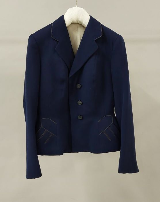 Tweedelig donkerblauw pakje, jasje met sierrandje la...