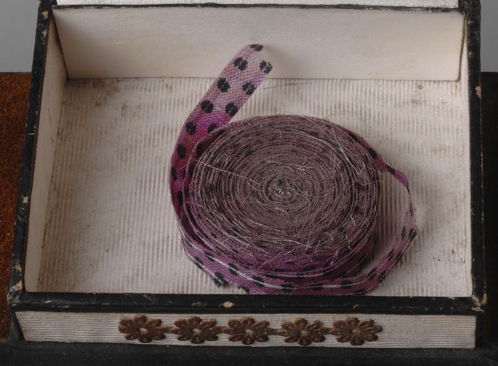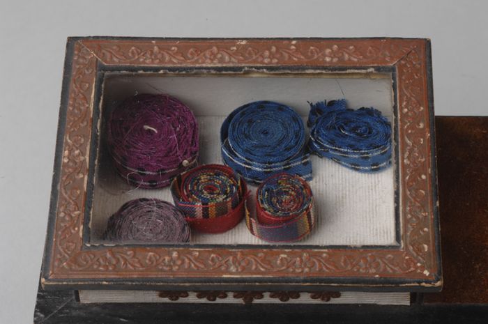 Zes kleine rollen hoedenband in toonbank hoedenwinkel